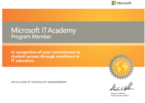 IPS College of Technology & Management is the First Institution in Gwalior Region which is Certified Microsoft Imaging Academy Program Member. The Microsoft Imaging Academy program has evolved under the guidance of educators worldwide. The program's core mission is to enable academic institutions to offer technology curriculum enriched with real-world skills. This Program allows designing courses and dynamic learning experiences for students to help them learn the Microsoft technologies in demand today. The curriculum is aligned to industry standards to ensure that the skills taught can be validated both in terms of personal accomplishment and professional qualifications for potential employers. Being a Microsoft Imaging Academy Program Member, Our Students will get the following benefits: -